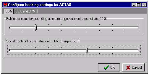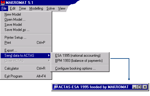 Wie aus nebenstehender Abbildung hervorgeht, sind die hierfür notwendigen MAKROMAT-Befehle im Datei-Menü untergebracht. Im Untermenü "Send data to ACTAS" kann man zwischen der Aufbereitung der Modellergebnisse im ESVG-Kontenrahmen für die nationale Einkommensrechnung (ESA 1995) und dem Zahlungsbilanzsystem (BPM 1993) wählen. Wird einer der beiden Menüpunkte gewählt, startet MAKROMAT eine neue Instanz von ACTAS (als COM-Server) und überträgt die aktuellen Modellergebnisse des gesamten Analyseintervalls (maximale Länge: 250 Perioden). MAKROMAT kümmert sich um alle notwendigen Einstellungen in ACTAS und syncrhonisiert die Analyseintervalle beider Programme, so dass nach der Datenübertragung sofort mit der VGR-Analyse begonnen werden kann. Zuvor lässt sich über den Konfigurationsdialog ("Configure booking options...") für die folgenden MAKROMAT-Größen die Aufteilung innerhalb der VGR-Systeme in ACTAS festlegen: