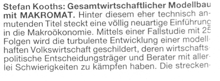 Kooths, Stefan: Gesamtwirtschaftlicher Modellbau mit MAKROMAT - Eine bedingungslose Einführung(sgeschichte); 492 Seiten, zahlreiche Abbildungen, mit CD-ROM, München: Vahlen, 2000.