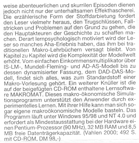 Die hierbei anfallenden technischen Aspekte der Modellbearbeitung werden von der dem Buch auf CD-ROM beliegenden Simulationssoftware MAKROMAT (Version 5.1) übernommen, die den Anwender bei der Einarbeitung in die gesamtwirtschaftliche Theorie durch entdeckendes und experimentelles Lernen unterstützt. Eine ausführliche Bedienungsanleitung ist als Anhang in das Lehrbuch integriert.